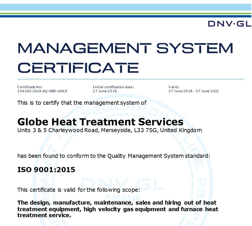 Here at Globe Heat Treatment Services Ltd we are proud to announce that we have been awarded ISO 9001:2015 certification, valid from 27th June 2018, by our certification body DNV-GL.